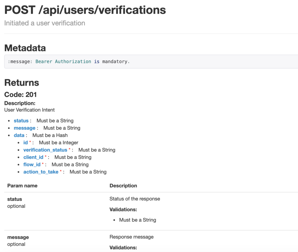 Hence, the ideal solution should be some kind of documentation which is not polluting your actual code but also automatically generating an external user-friendly stylised documentation. One such tool I found which does all this for Ruby on Rails APIs is apipie.