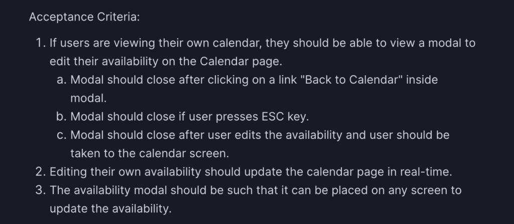 - Users should be able to edit their availability on this modal and the calendar page should update in realtime.