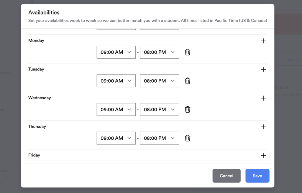 Clicking on the View/Edit availability opens a modal which looks like this: